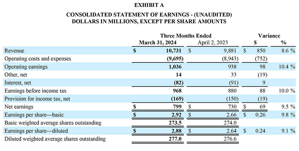 RESTON, Va. – General Dynamics (NYSE: GD) today reported first-quarter 2024 revenues of $10.7 billion, up 8.6% from the first quarter of 2023. Operating earnings of $1 billion were up 10.4% from the year-ago quarter, with operating margins expanding 20 basis points to 9.7% from the year-ago quarter. Diluted earnings per share (EPS) were $2.88, up 9.1% from the year-ago quarter.